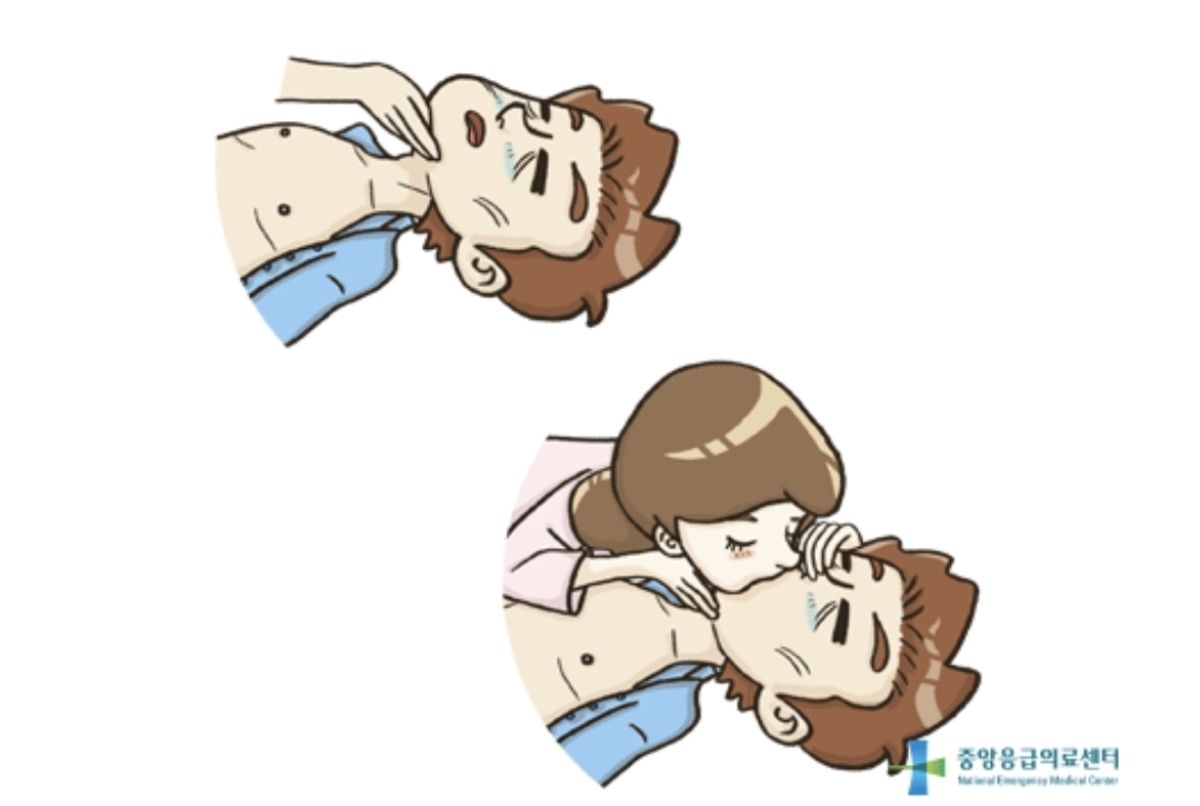 코를 막고 구조자의 입을 완전히 밀착하여 정상호흡을 약 1초 동안 2회 숨을 불어 넣는다.