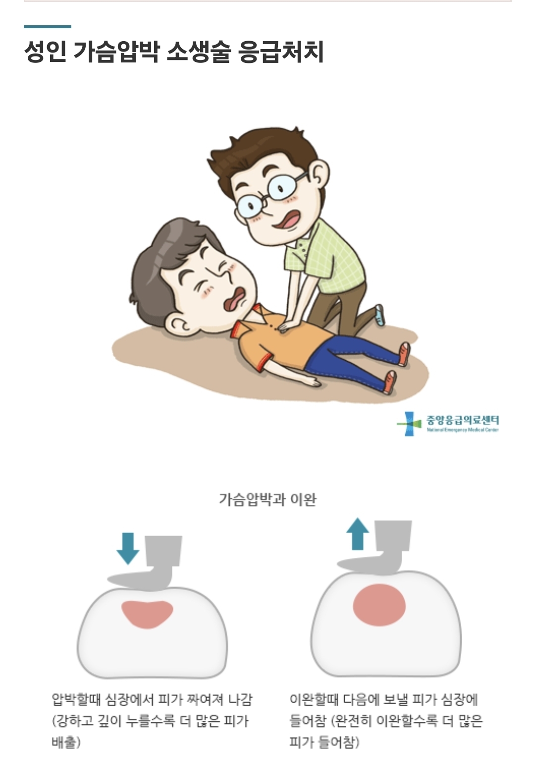 * 압박 시 양팔을 쭉 편 상태에서 체중을 실어서 환자의 몸과 수직이 되게 눌러줘야 한다.